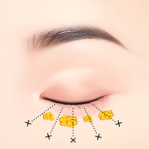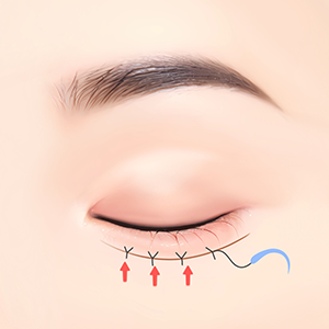 흉터를 최소화하기 위해서 눈밑 결막을 미세 절개 후 눈밑지방제거 또는 재배치로 눈밑을 평평하게 만들어 줍니다.