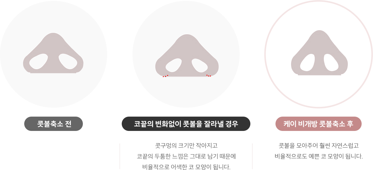 케이의 비개방 콧볼축소는 코 안쪽에서 실과 바늘이 들어갈 정도의 미세한 절개창을 낸 후, 콧볼축소용 특수 봉합사를 이용하여 겉으로 드러나는 흉터 없이 콧볼축소를 시행합니다.