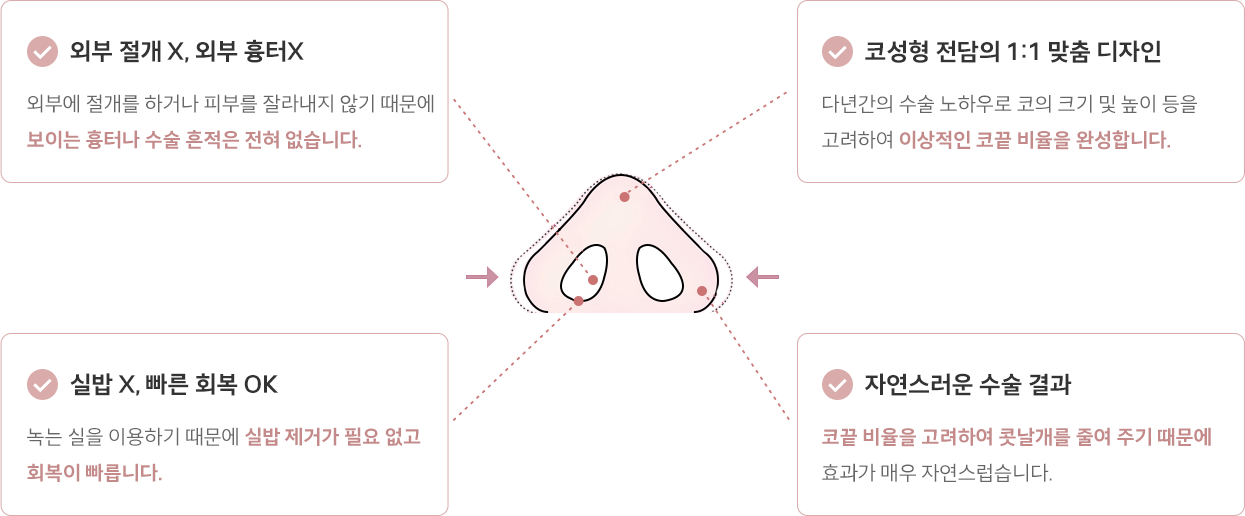 특수 봉합사를 이용하여 겉으로 드러나는 흉터 없이 콧볼축소를 시행합니다.