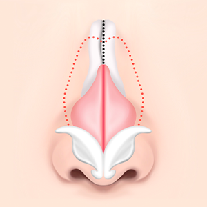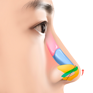 비중격연골 등 자가조직을 연결해 코의 길이를 연장하고, 콧날개 연골을 분리한 후 이동시켜 짧은코를 교정합니다.